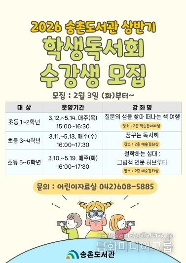시민행정신문 강갑수 기자 | 대전 대덕구 송촌도서관은 어린이들의 올바른 독서 습관 형성과 창의적 사고력 증진을 위해 ‘2026년 상반기 학생독서회’ 수강생을 모집한다.