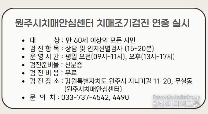 시민행정신문 강갑수 기자 | 원주시치매안심센터는 치매 조기 발견과 적기 치료를 위해 지역 내 60세 이상 주민을 대상으로 치매 조기 검진 사업을 연중 실시하고 있다.