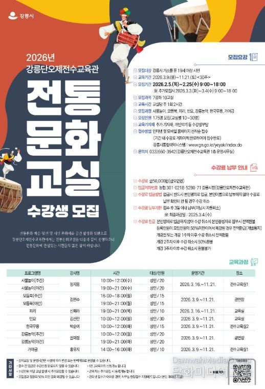 시민행정신문 강갑수 기자 | 강릉단오제전수교육관은 강릉시민의 문화향유 기회와 전통문화 저변 확대를 위해 2026년도 전통문화교실 수강생을 모집한다.