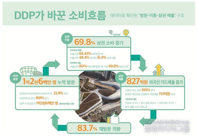 실제로 DDP가 위치한 동대문역사문화공원역(2‧5호선) 승하차 인원이 몇 년새 뚜렷하게 증가했으며, 네비게이션 목적지 검색건수도 늘었다. 또한 DDP 방문객 10명 중 7명(69.8%)은 주변 상권을 이용했다고 답해 DDP가 지역 상권 소비 매개로 자리잡았다는 것이 데이터로 확인되고 있다. 특히 외국인들이 만족하는 서울 대표 명소로 꼽히며 외국인의 인근 상권 지출이 2년새 6.5배나 증가했다.