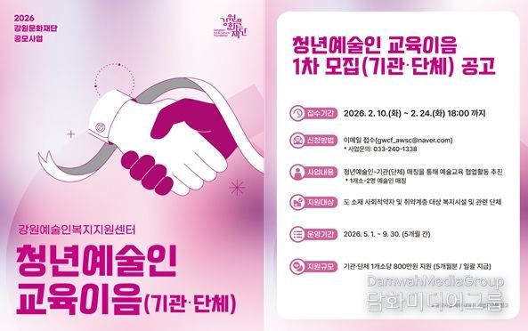 시민행정신문 강갑수 기자 | 강원문화재단은 도내 청년예술인의 안정적인 활동 기반을 조성하고 문화예술의 사회적 가치를 확산하기 위해 '2026년 청년예술인 교육이음 사업' 공모를 추진한다.