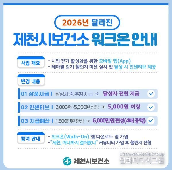 이에 따라 제천시보건소는 2026년부터 워크온 운영 방식을 개선한다. 미션을 완료한 달성자 전원에게 보상을 지급하는 방식으로 전환하고, 기존 3천 원에서 5천 원 수준이었던 보상 금액도 5천 원 이상으로 상향한다.