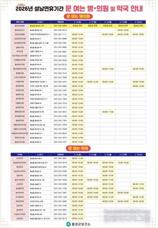 횡성군보건소에 따르면 2월 17일 설날 당일에는 보건소에서 오전 9시부터 오후 6시까지 진료를 실시해, 연휴 기간 발생할 수 있는 경증 환자 및 응급 상황에 대비할 계획이다.