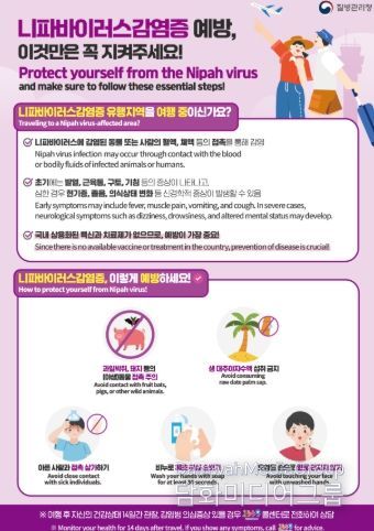 시민행정신문 기자 | 이천시보건소는 니파바이러스 발생 국가(인도, 방글라데시 등)를 여행할 때 감염 예방을 위해 예방 수칙을 철저히 준수해 줄 것을 당부했다.