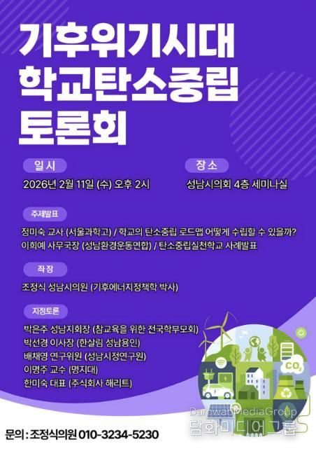 시민행정신문 기자 | 기후위기 대응과 학교 현장의 탄소중립 실천 방안을 논의하기 위한 '기후위기 시대 학교 탄소중립 토론회'가 오는 2026년 2월 11일 오후 2시, 성남시의회 4층 세미나실에서 열린다.