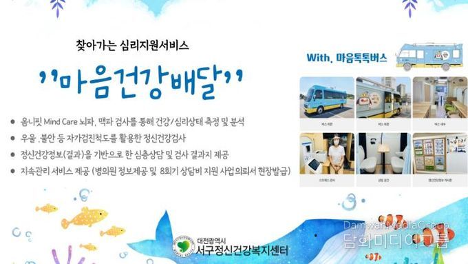 시민행정신문 강갑수 기자 | 대전 서구 정신건강복지센터는 올해 11월까지 찾아가는 정신건강 이동 상담 ‘마음건강배달’ 사업을 운영한다.