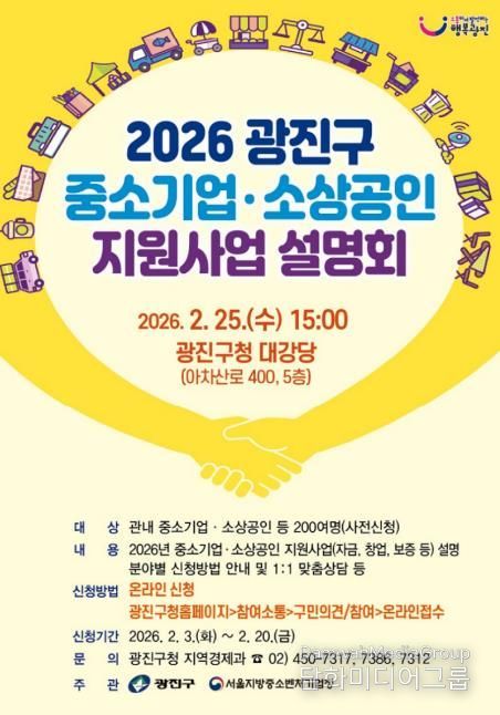 시민행정신문 강갑수 기자 | 광진구가 2월 25일 광진구청 대강당에서 서울지방중소벤처기업청과 함께 ‘2026 광진구 중소기업‧소상공인 지원사업 설명회’를 개최한다.