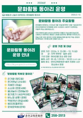 문화활동 동아리 운영과 관련한 자세한 사항은 춘천교육문화관 문헌정보과 문화활동팀으로 문의하면 된다.