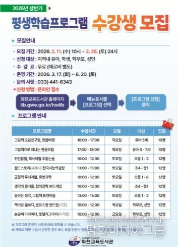 수강생 모집 기간은 2월 11일부터 2월 28일까지이며, 화천교육도서관 누리집을 통해 선착순으로 접수한다.