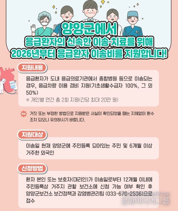 지원 대상은 이송일 기준 양양군에 주민등록이 되어 있는 군민과 6개월 이상 거주한 외국인이며, 이송 당시 구급차 출동·처치기록지에 중증도가 ‘응급’으로 표기된 경우에 한한다.