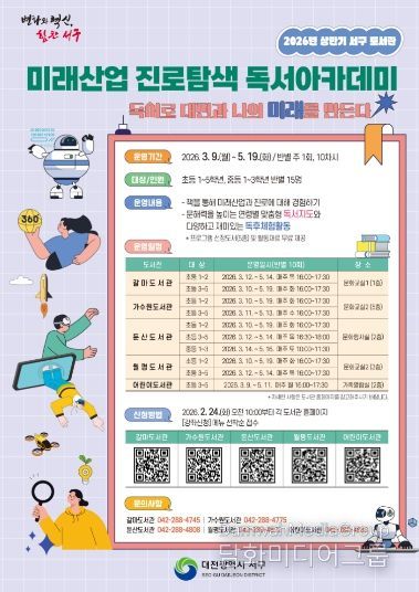 시민행정신문 강갑수 기자 | 대전 서구 공공도서관은 초등·중학생 독서지도 및 독후활동을 위한 ‘상반기 미래산업 진로 탐색 독서아카데미’를 운영한다고 12일 밝혔다.