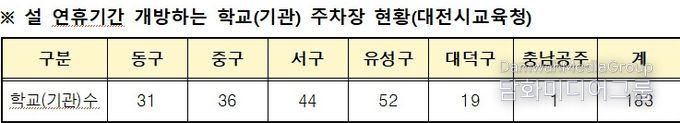 시민행정신문 기자 | 대전시교육청은 설 연휴 기간인 2월 14일부터 18일까지 대전을 찾는 귀성객과 지역 주민의 주차 편의를 위해 관내 각급 학교와 교육청, 산하기관 등 총 183곳의 주차장을 무료로 개방한다고 밝혔다.