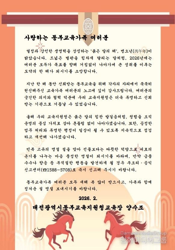 시민행정신문 기자 | 대전동·서부교육지원청은 설 명절을 맞이하여 청렴 실천의지를 담은 교육장 서한문을 관내 유·초·중학교 및 교육지원청 교직원들에게 발송했다고 밝혔다.