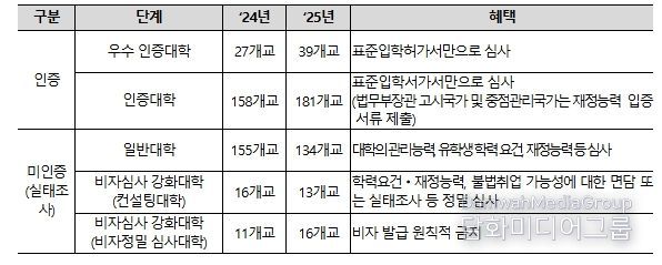 한편, 인증대학 외에 외국인 유학생이 1명 이상 재적 중인 대학에 대해서는 ‘유학생 유치‧관리 실태조사’를 실시하고, 일정 기준을 충족하지 못할 시 비자심사 강화대학(컨설팅대학, 비자정밀 심사대학)으로 지정했다. 이를 통해 대학이 외국인 유학생의 유치 단계에서 어학 능력과 재정 능력 등을 엄격히 심사하도록 하고, 유학생 관리 전반에 대한 대학의 책임을 강화할 예정이다.
