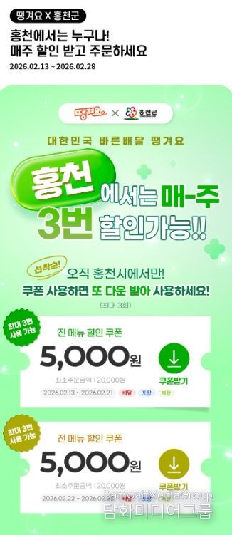 이번 이벤트는 신한은행 ‘땡겨요’ 사업단과의 공동 마케팅 협약을 바탕으로 추진됐으며, 공공배달앱 활성화를 통해 소상공인의 경영 부담을 완화하고 지역 경제의 활력을 회복하고자 마련된 홍천군 차원의 정책적 대응이다.