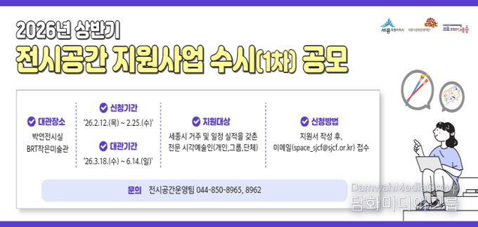 시민행정신문 강갑수 기자 | 세종시문화관광재단은 2월 12일부터 2월 25일까지 지역 시각예술인의 창작활동을 지원하고 시민들에게 다양한 전시를 선보이기 위한 ‘2026년 상반기 전시공간 지원사업 수시(1차)’ 공모를 진행한다.