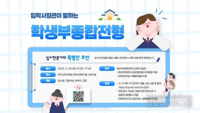 채선영 교육장은 “이번 특강을 통해 학생과 학부모가 입학사정관의 평가 관점을 이해하고 보다 체계적으로 대입을 준비하는 데 도움이 되기를 기대한다”며 “앞으로도 학생들의 진로·진학 설계를 지원할 수 있도록 맞춤형 정보를 지속적으로 제공하겠다”고 말했다.