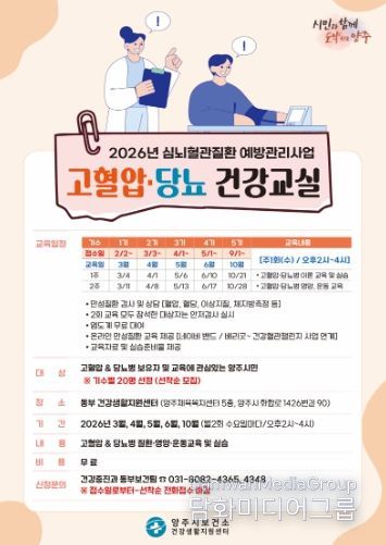 시민행정신문 기자 | 양주시보건소 동부 건강생활지원센터에서는 시민의 심뇌혈관질환 예방과 만성질환 관리를 위해 '2026년 고혈압·당뇨병 건강교실'을 운영한다.