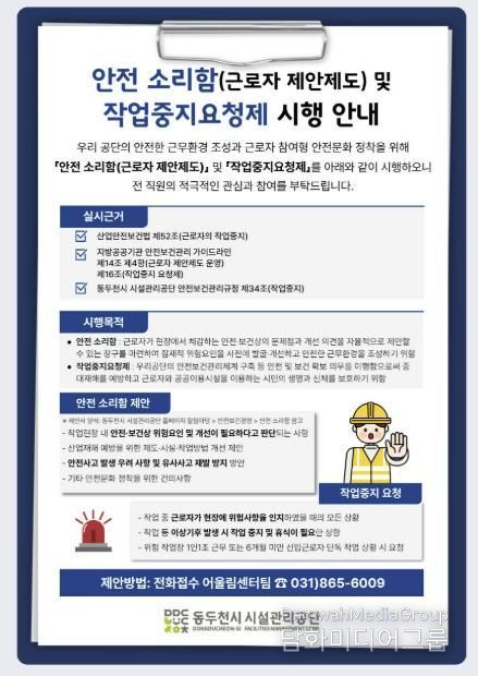 ‘안전 소리함’과 ‘작업중지요청제’에 대한 자세한 내용은 동두천시 시설관리공단 누리집 알림마당 내 안전보건경영 탭에서 확인할 수 있다.
