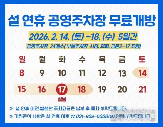시민행정신문 강갑수 기자 | 파주도시관광공사는 12일, 2026년 설 명절을 맞아 시민과 고향을 방문하는 귀성객의 교통편의를 위해 공영주차장 24곳(부설주차장 시청, 의회, 금촌2-17 포함)을 오는 14일(토)부터 18일(수)까지 5일간 무료로 개방한다고 밝혔다.
