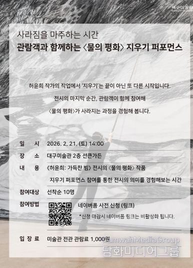 시민행정신문 강갑수 기자 | 대구문화예술진흥원 대구미술관은 제25회 이인성미술상 수상자전 “허윤희: 가득찬 빔”의 전시 종료를 앞두고, 출품작 ‘물의 평화’ 지우기 퍼포먼스를 관람객 참여 프로그램으로 진행한다.