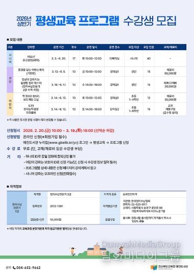 시민행정신문 기자 | 경상북도교육청 예천도서관(관장 김미연)은 지역 주민의 평생학습 지원을 위해 2026년 상반기 평생교육 프로그램 수강생을 모집한다.