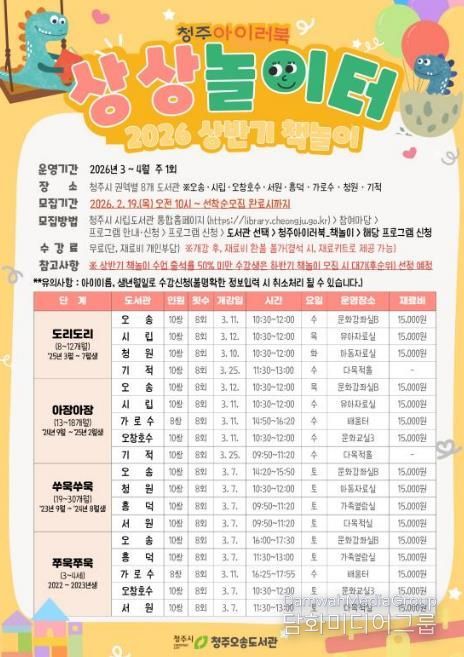 시민행정신문 강갑수 기자 | 청주오송도서관은 오는 2월 28일까지 청주시 영유아와 양육자를 대상으로 ‘청주 아이러북(LoveBook)’ 상반기 책놀이 프로그램 수강생을 모집한다고 20일 밝혔다.