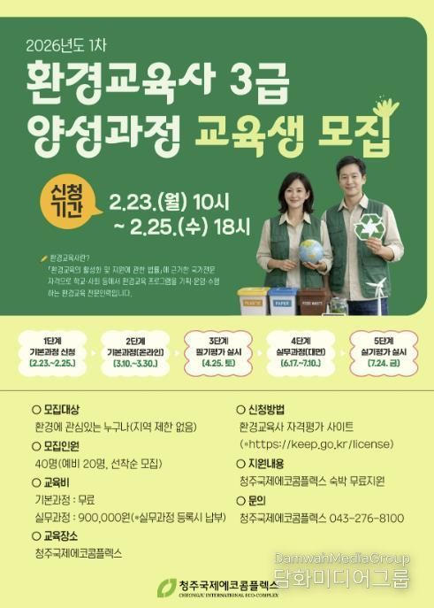 시민행정신문 강갑수 기자 | 청주시환경교육센터(청주국제에코콤플렉스)는 ‘2026년 제1차 환경교육사 3급 양성과정’ 교육생을 모집한다고 20일 밝혔다.