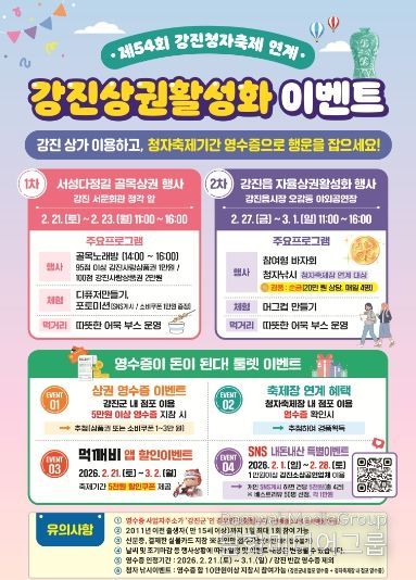 축제 기간에는 먹깨비 앱을 통한 할인 이벤트가 진행돼 5천 원 할인쿠폰이 제공되며, 2월 한 달간 진행되는 SNS 내돈내산 특별이벤트를 통해 강진 소상공인 업소 이용 후 개인 SNS에 게시하면 추가 혜택도 받을 수 있다.