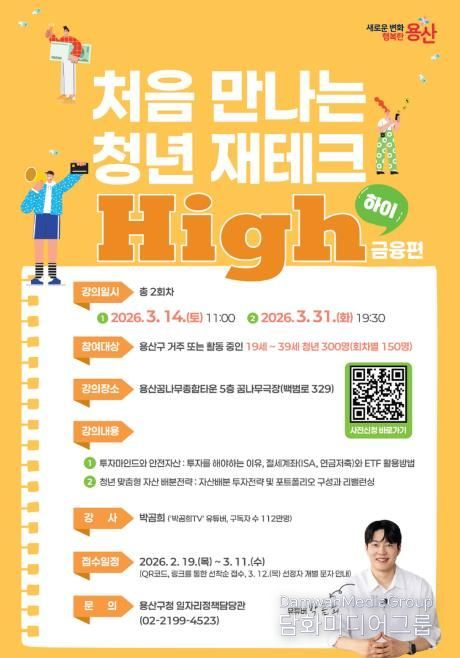 시민행정신문 강갑수 기자 | 서울 용산구가 19일부터 내달 11일까지 ‘처음 만나는 청년 재테크 하이(High) 금융편’ 교육 프로그램에 참여할 청년 총 300명을 모집한다. 경제 교육 수요를 반영해, 지역 내 청년들의 합리적인 금융 의사결정과 기초 재테크 역량 강화를 위해 마련한 자리다.