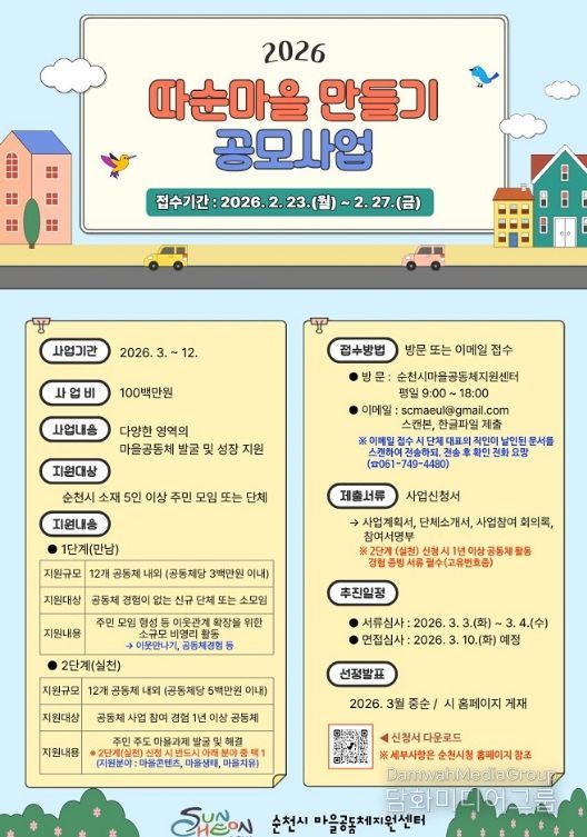 시민행정신문 강갑수 기자 | 순천시는 주민 주도의 마을문제 해결과 마을공동체 발굴․성장을 지원하기 위해 '2026년 따순마을 만들기 공모사업' 참여자를 모집한다고 밝혔다.