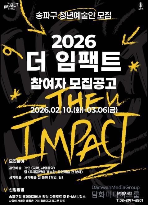 시민행정신문 강갑수 기자 | 서울 송파구는 재능 있는 청년예술인을 발굴·지원하는 ‘2026 더 임팩트’ 참가자를 오는 3월 6일 오후 5시까지 모집 중이라고 23일 밝혔다. 이번 공모는 지난 2월 10일부터 접수가 진행되고 있다.