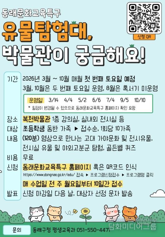 동래구 관계자는 “‘유물탐험대, 박물관이 궁금해요!’ 프로그램은 복천박물관 소속 강사진의 자세하고 흥미로운 해설과 함께 유물을 탐색하며 역사 속 이야기를 배우는 프로그램이다”라며 “호기심이 가득한 초등학생들이 우리 지역의 유물과 문화유산을 재밌게 탐구하고, 가족과 함께 뜻깊은 시간을 보내길 바란다”라고 말했다.
