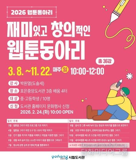 시민행정신문 강갑수 기자 | 포항시립포은중앙도서관은 오는 24일 오전 10시부터 2026년 웹툰 동아리 수강생을 선착순 모집한다. 웹툰 동아리는 지역 중·고등학생을 대상으로 3월부터 본격 운영될 예정이다.