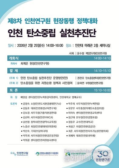 시민행정신문 김학영 기자 | 인천연구원은 인천녹색환경지원센터와 함께 2월 25일 오후 2시, 인천대학교 미래관 세미나실에서 인천 탄소중립 실천추진단을 출범시키고, 시민참여 방안 마련을 주제로 '제8차 인천연구원 현장동행 정책대화'를 공동 개최한다.