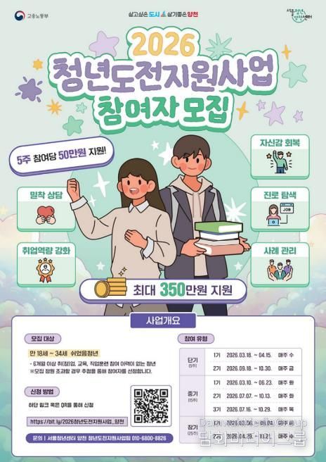 이기재 양천구청장은 “반복되는 취업 실패의 좌절과 경제적 어려움 등으로 구직을 단념한 청년들이 다시 사회와 연결되어 자신의 가능성을 펼칠 수 있도록 지원을 아끼지 않겠다”며 “청년들의 도전을 응원하는 이번 사업에 많은 관심과 참여를 바란다”고 말했다.