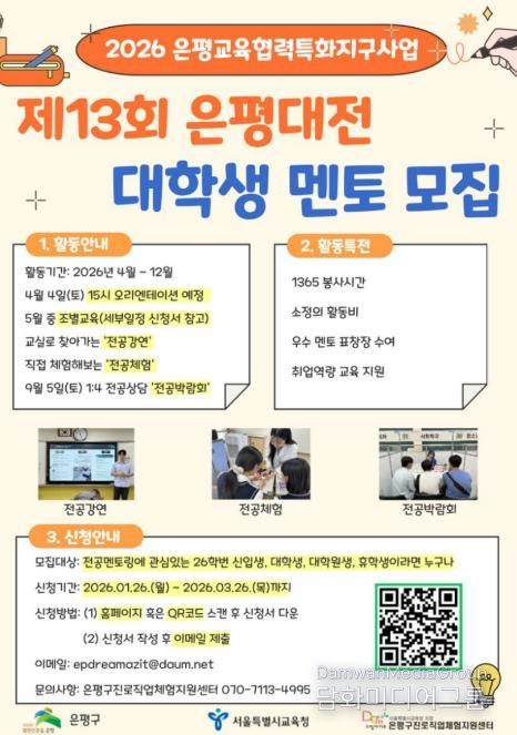멘토 모집 기간은 다음달 26일까지이며, 신청은 은평구진로직업체험지원센터 누리집 또는 홍보물 속 큐알(QR)코드를 통해 신청서를 내려받아 전자우편으로 제출하면 된다.