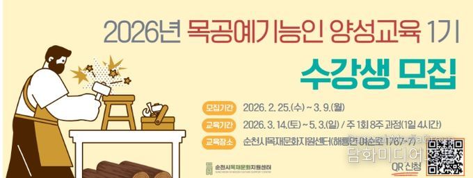 시민행정신문 강갑수 기자 | 순천시는 시민들의 목공 체험 기회를 확대하고 목재문화 활성화를 위해 ‘2026년 목공예기능인 양성교육 1기’ 수강생을 오는 3월 9일까지 모집한다고 밝혔다.