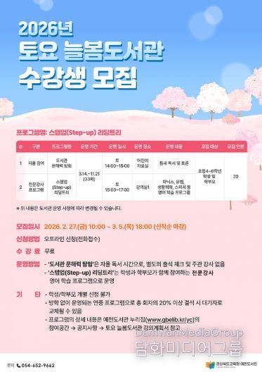 시민행정신문 기자 | 경상북도교육청 예천도서관은 지역 어린이들의 문해력 향상과 영어 학습 역량 강화를 지원하기 위해 2026년 토요 늘봄도서관 수강생을 모집한다.