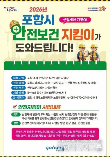 한편, 안전보건지킴이 현장 점검 및 컨설팅 지원을 희망하는 사업장은 포항시 홈페이지 고시·공고란에서 ‘2026년 포항시 관내 소규모 사업장 안전보건지킴이 사업장 모집 공고’를 확인하거나, 포항시 경제노동정책과 노동안전팀으로 문의하면 된다.