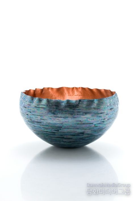 'Blue Wave No.5'는 한국 전통 자개 공예의 ‘끊음질’ 기법을 현대적으로 확장한 작품으로, 금속 기형 위에 자개를 한 조각씩 붙여 밀도 높은 표면을 구축한 것이 특징이다.