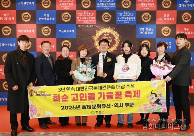시민행정신문 강갑수 기자 | 화순군은 지난 24일 서울 피스앤파크 컨벤션홀(용산 전쟁기념관)에서 열린 제14회 대한민국축제콘텐츠대상 시상식에서 ‘2025 화순 고인돌 가을꽃 축제’가 축제 문화유산·역사 부문 ‘대상’을 수상했다고 밝혔다.