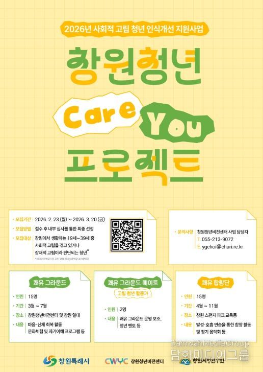 시민행정신문 기자 | 창원특례시 창원청년비전센터는 사회적 고립 청년의 건강한 사회 복귀를 돕기 위해 ‘2026년 창원 청년 쾌유(Care-you) 프로젝트’ 참여자를 2월 23일부터 3월 20일까지 모집한다.
