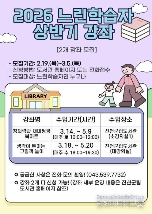시민행정신문 강갑수 기자 | 충북 진천군립도서관이 모두에게 열린 공간을 제공하고 정보 불평등을 해소하기 위해 느린 학습자를 위한 독서문화 프로그램 참여자를 모집한다.