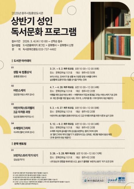 시민행정신문 강갑수 기자 | 원주시립중앙도서관은 3월 21일부터 ‘2026년 상반기 성인 독서문화 프로그램’을 운영한다.