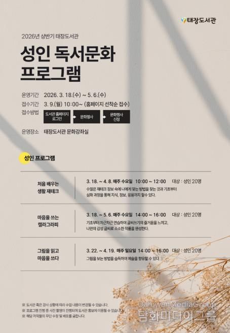시민행정신문 강갑수 기자 | 원주시 태장도서관은 오는 3월 시민을 대상으로 ‘2026년 상반기 성인 독서문화 프로그램’을 운영한다.