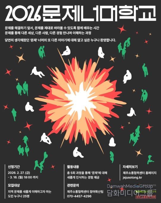 시민행정신문 강갑수 기자 | 제주특별자치도와 제주특별자치도 소통협력센터가 도민 주도의 지역문제 탐구를 지원하는 교육 프로그램 ‘2026 문제너머학교’를 운영하고, 27일부터 3월 16일까지 참여자를 선착순으로 모집한다.