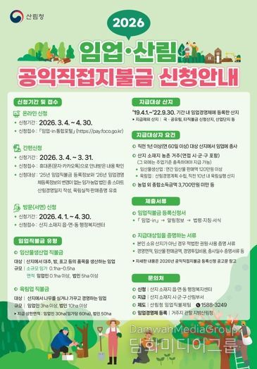 박찬국 경상북도 농축산유통국장은 “공익직불금은 농업인의 경영 안정을 뒷받침하는 핵심적인 소득 지원 제도”라며 “올해는 신청기간을 통합해 농업인 불편을 줄인 만큼, 자격 요건을 갖춘 농업인께서는 신청 누락 등으로 불이익을 받지 않도록 기간 내 반드시 신청해 주시길 당부드린다”고 말했다.
