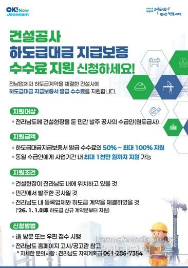 시민행정신문 강갑수 기자 | 전라남도가 건설산업 활력을 높이고 하도급 업체 보호를 위해 ‘2026년 건설공사 하도급대금 지급보증 수수료 지원사업’을 확대 추진한다.