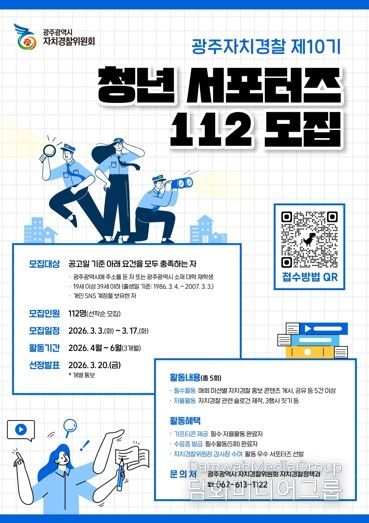 시민행정신문 이존영 기자 | 광주광역시 자치경찰위원회는 3일부터 17일까지 ‘제10기 청년 서포터즈 112’ 참여자 112명을 모집한다.